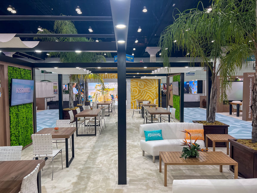 We designed a spacious 3,600 sq ft pavilion with a large central booth and 11 identical partner spaces for a cohesive visual layout. We managed permitting and logistics for live palm tree rentals to infuse a natural, tropical atmosphere. On the technical side, our team programmed the AV system so that all 16 screens—spread across the main and partner booths—would seamlessly sync during Kissimmee-branded segments, while allowing partners to showcase their own video content the rest of the time.